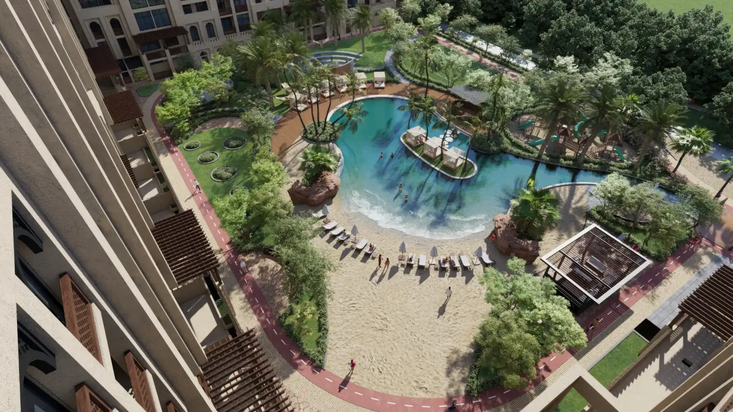 - Green spaces make up 60% of the development, with amenities such as indoor and outdoor swimming pools, bicycle tracks, sports clubs, and community gardens, according to the statement.